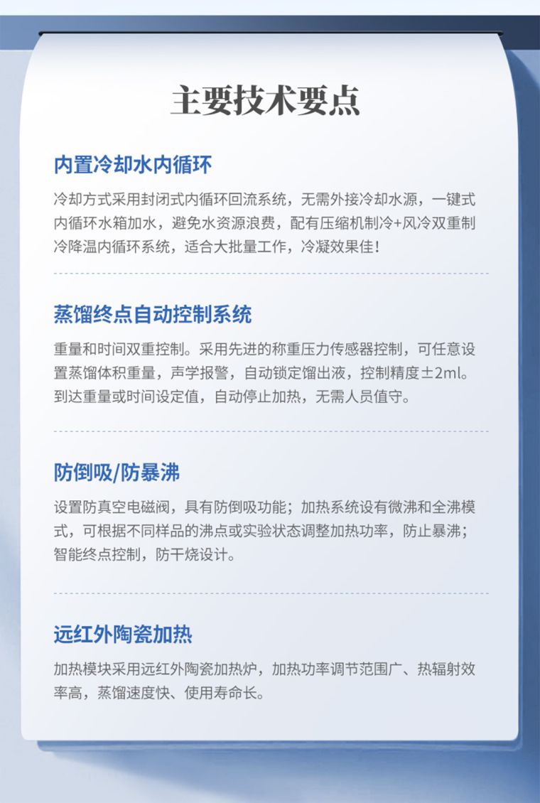 5、蒸馏终点控制:自动侦测蒸馏终点功能,采用称重和时间双重控制,蒸馏体积控制在±2ml之内,自动化程度高;