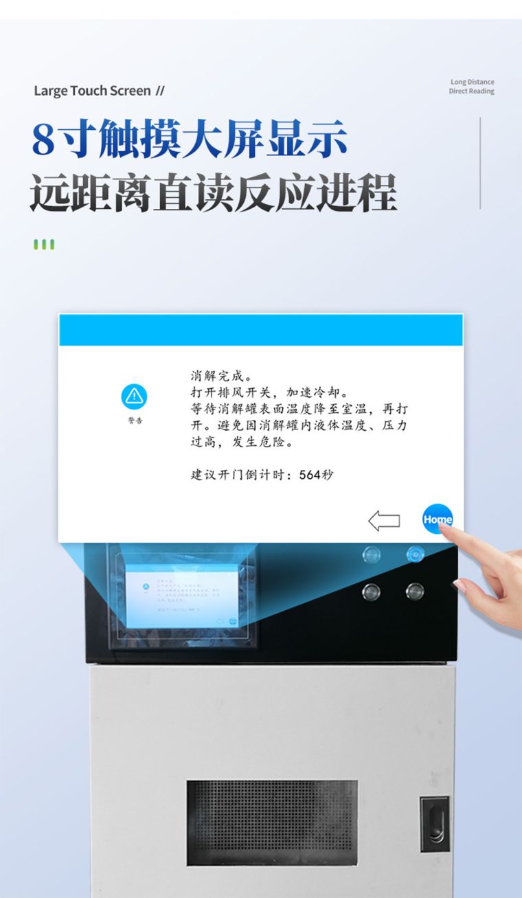 (10)控制方式:触摸屏设计,8寸TFT-LED(800X480彩)大屏幕显示,远距离直读反应进程,实时显示密闭反应罐温度、压力,并可实时显示温压曲线;