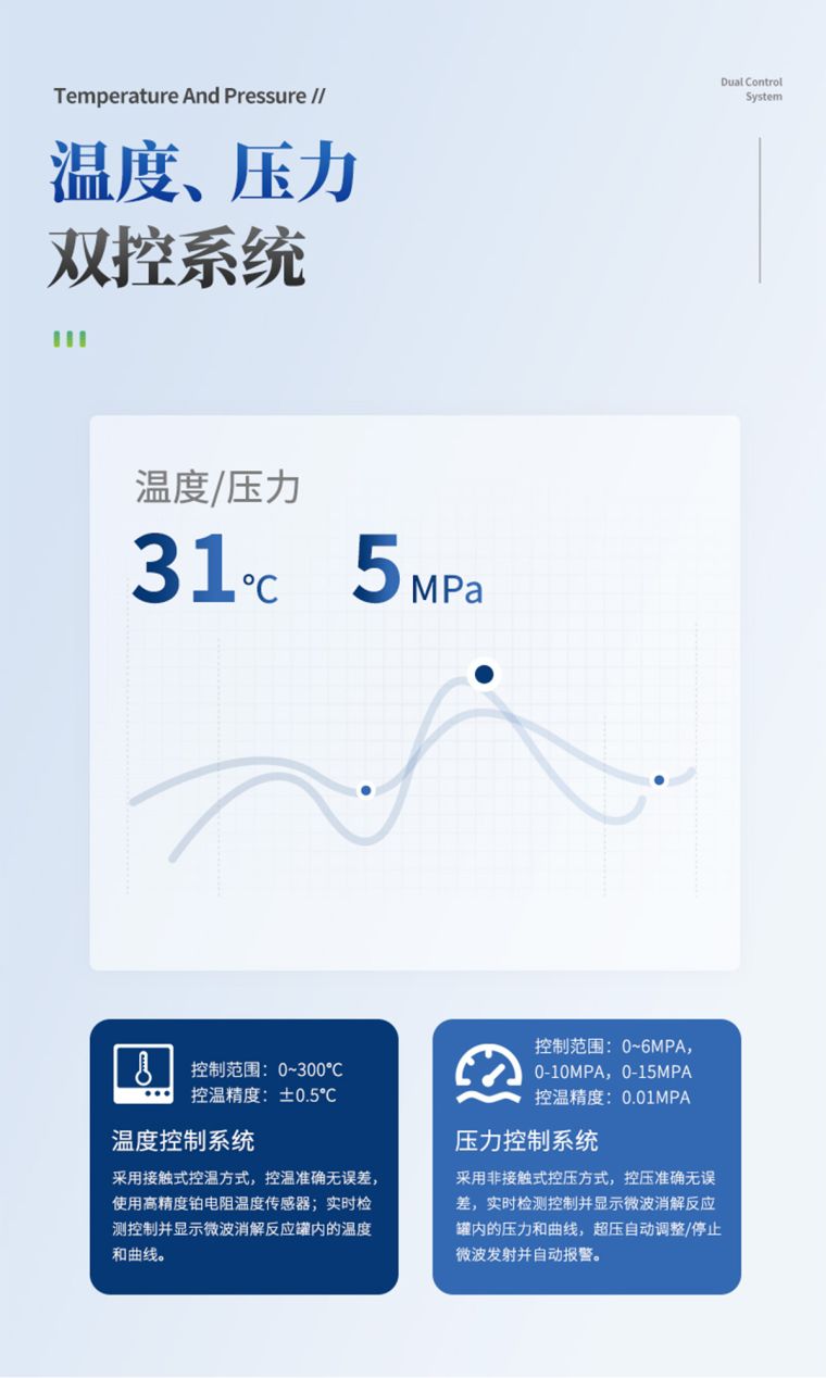 (1)温度控制系统:采用接触式控温方式,控温准确无误差,使用高精度铂电阻温度传感器;实时检测控制并显示微波消解反应罐内的温度和曲线;