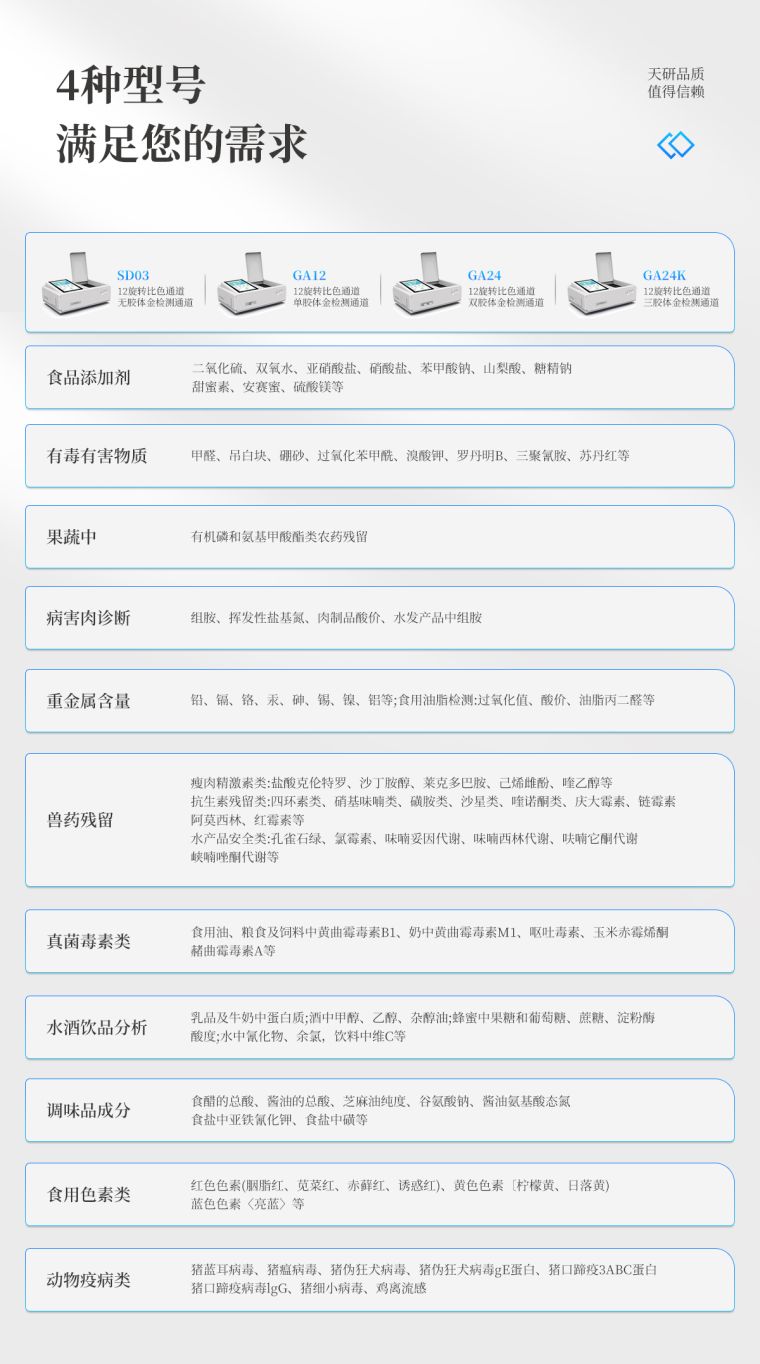 用于快速检测食品中吊白块,仪器预留其他项目检测程序和端口,根据日后需求可方便的自主增加检测项目。日后可升级为检测,水产品,肉制品,面制品的综合类型仪器。