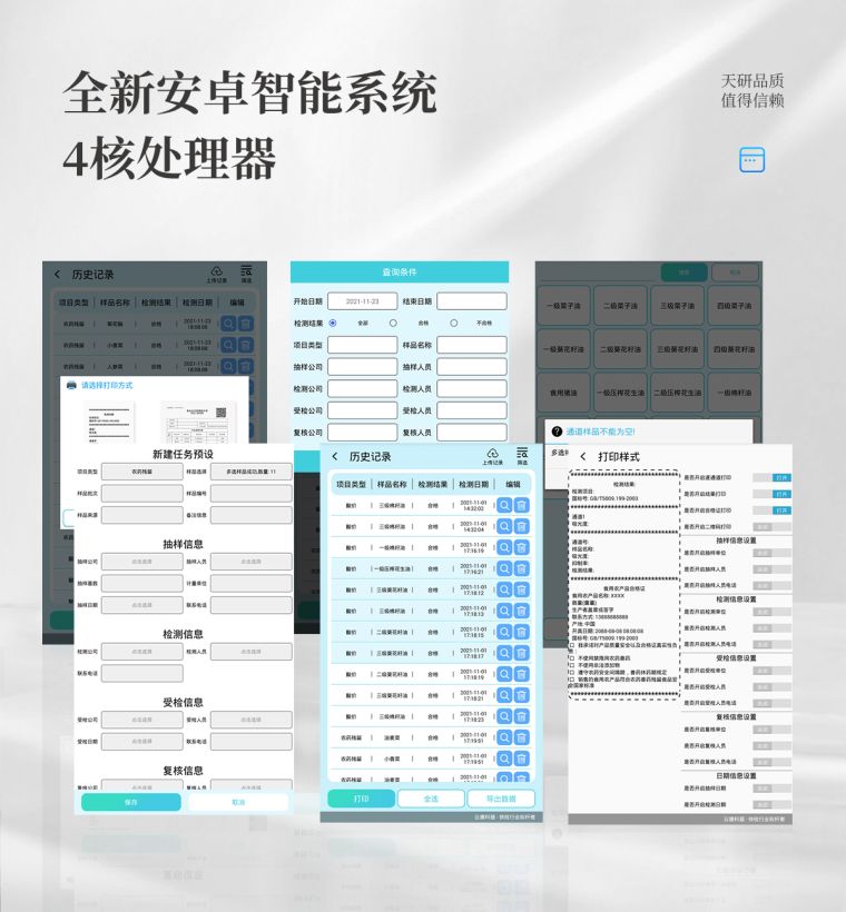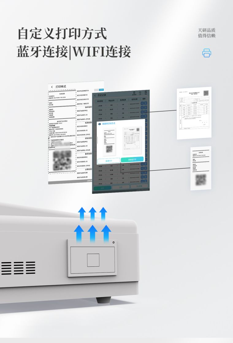 自定义打印系统:内置全新打印系统,新创自定义打印方式,可按需灵活设置开启或关闭:产品合格证(国家农业部标准要求),二维码,抽样信息、检测信息,受检信息、复核信息、抽样日期、检测日期等信息的打印。