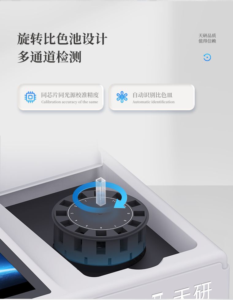 ★检测通道:≥12通道;采用精密旋转比色池设计,使用同芯片同光源校准精度,解决不同光源之间的误差值。1-12通道间误差0.1%。(专利号:ZL202022821055.2)