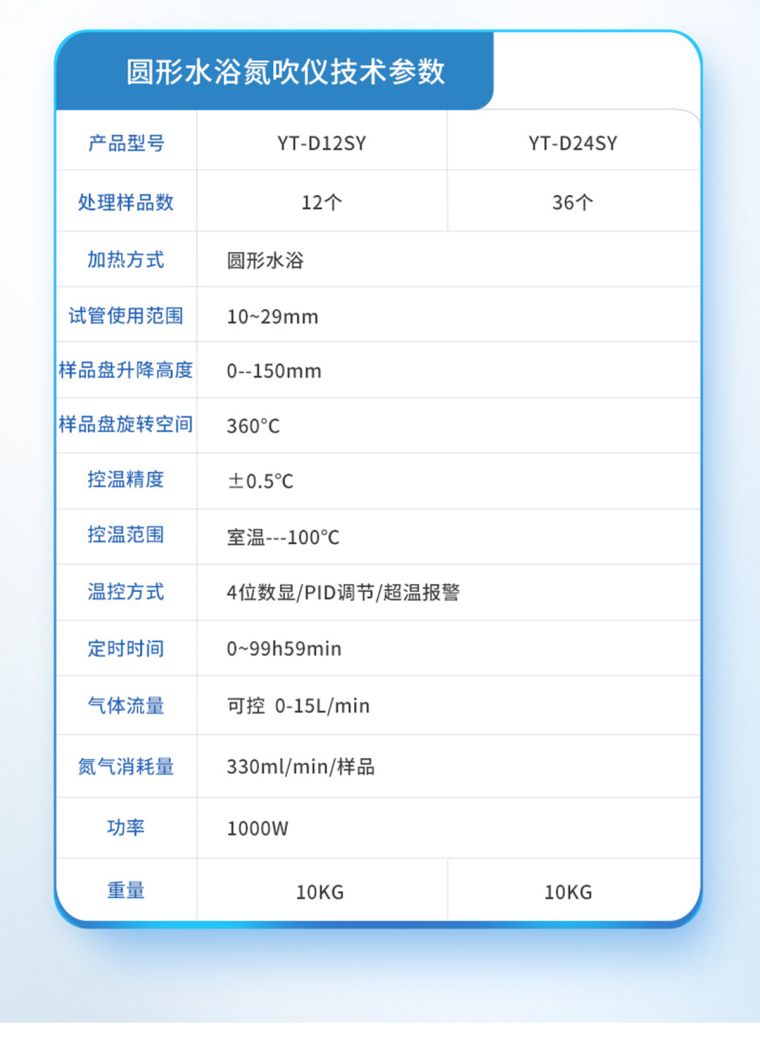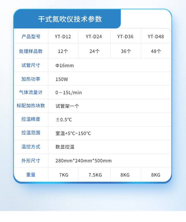 | 产品型号 | 处理样品数 | 孔径尺寸 | 氮气消耗量 | 气体流量计 | 标配加热块数 | 控温精度 | 控温范围 | 温控方式 | 外形尺寸 | 功率 | 重量 |