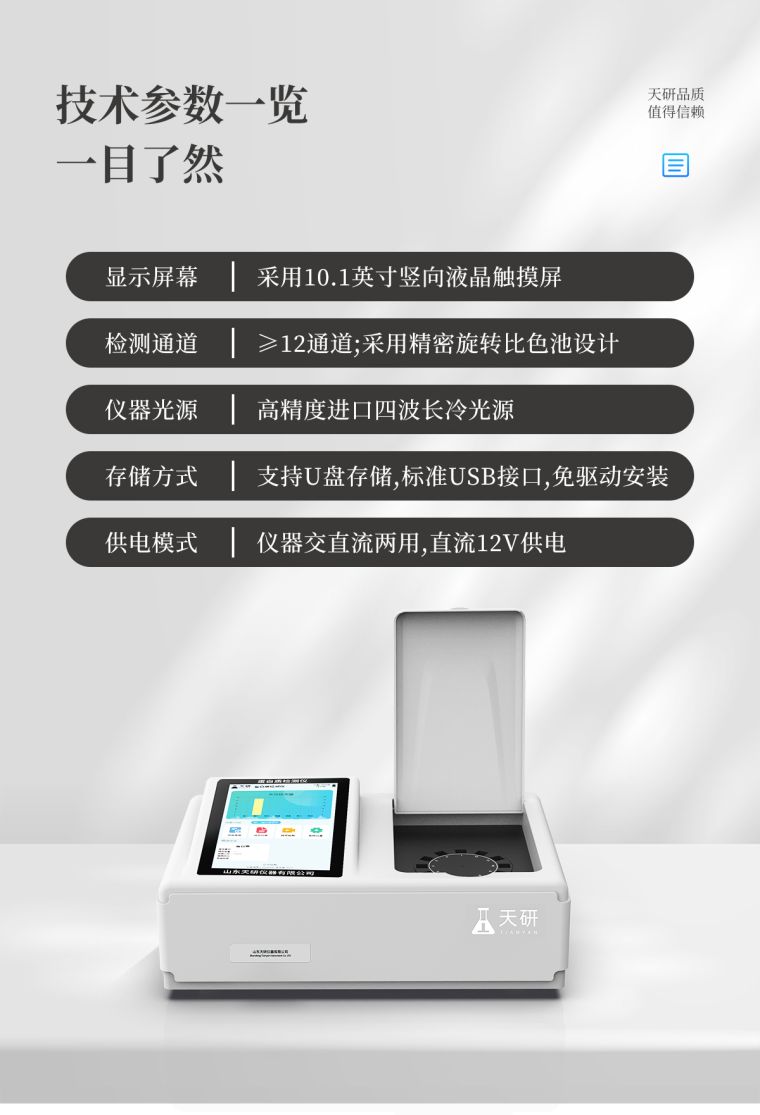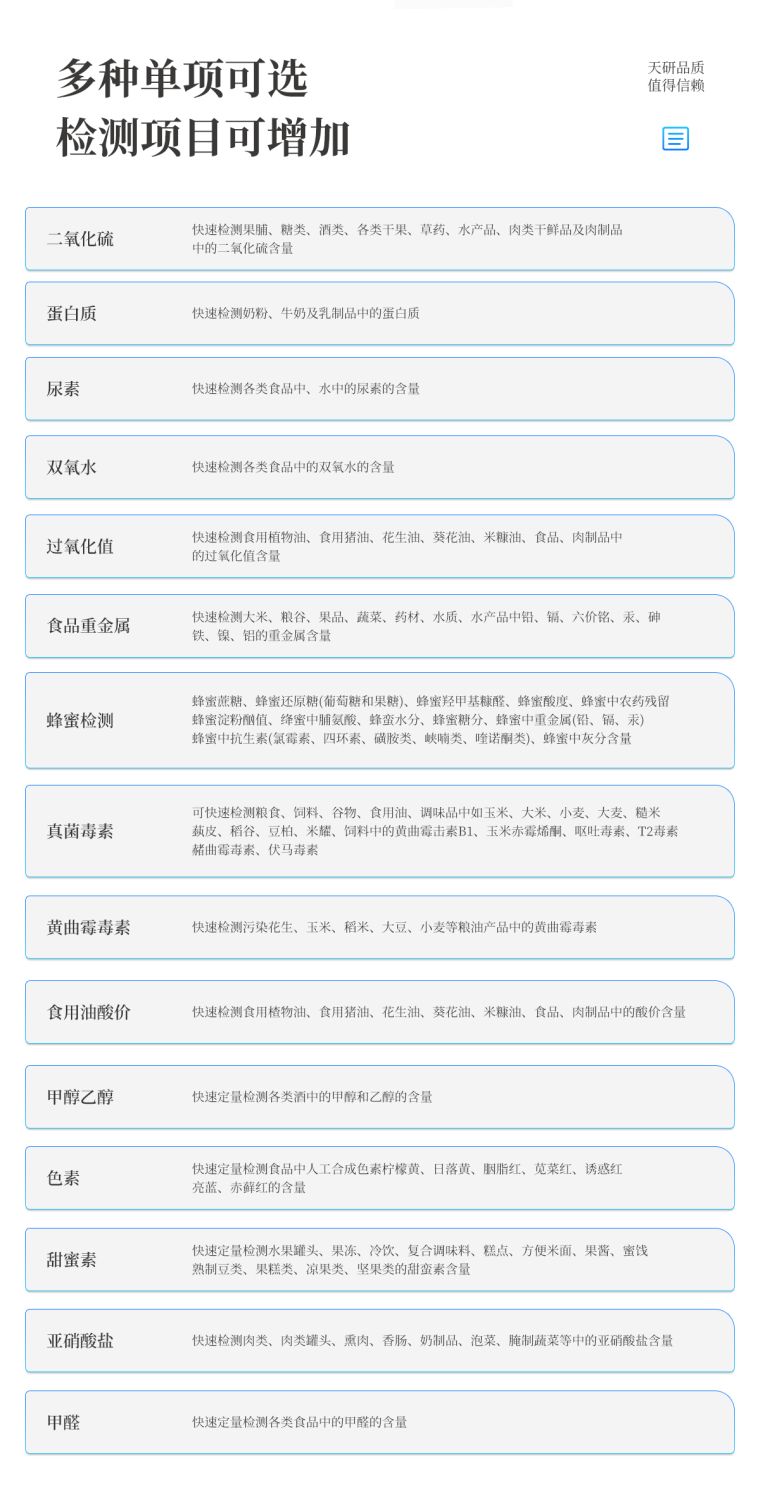 仪器采用台式一体化系统检测技术,将分光光度模块、新型农残检测模块、数字化管理模块、无线通讯模块高度集成于一体,支持检测200种食品安全检测项目,同时预留升级检测方法。