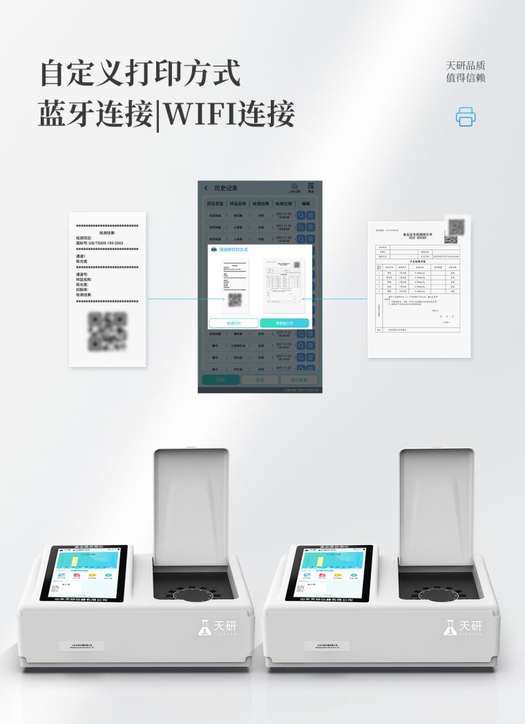 自定义打印系统:内置全新打印系统,新创自定义打印方式,可按需灵活设置开启或关闭:产品合格证(国家农业部标准要求),二维码,抽样信息、检测信息,受检信息、复核信息、抽样日期、检测日期等信息的打印。