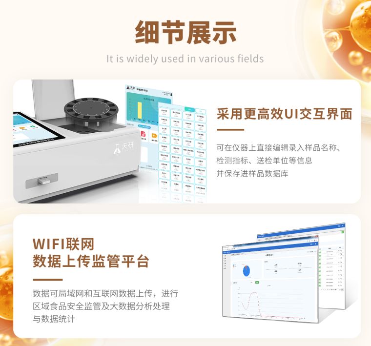 我司生产的高智能蜂蜜检测仪为集成化食品安全快速检测分析设备,采用台式一体化设计,可快速检测200多种食品安全项目,包含非食用化学物质、滥用食品添加剂、农药残留、兽药残留、重金属、病害肉、营养强化剂、抗生素类残留、激素类残留、真菌毒素类残留、化学类残留等项目的定性定量检测。该高智能食品安全检测仪为集成化食品安全快速检测分析设备,目前已于食药监局、卫生部门、高教院校、科研院所、农业部门、养殖场、屠宰场、食品肉产品深加工企业及检验检疫部门等单位广泛使用。