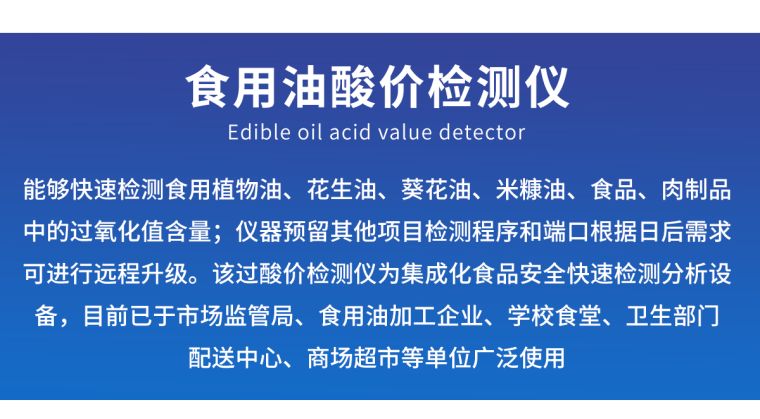 广泛应用于质量监督检验、工商管理、油炸食品生产基地、食药监局、卫生部门、肉制品食品深加工企业、商场超市、各大食品安全监测系统等单位使用。