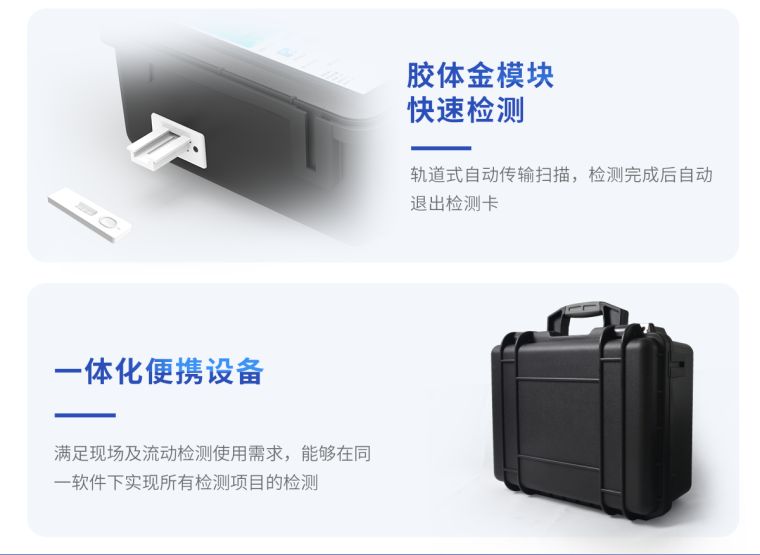 胶体金模块检测方式:轨道式自动传输扫描,检测完成后自动退出检测卡。