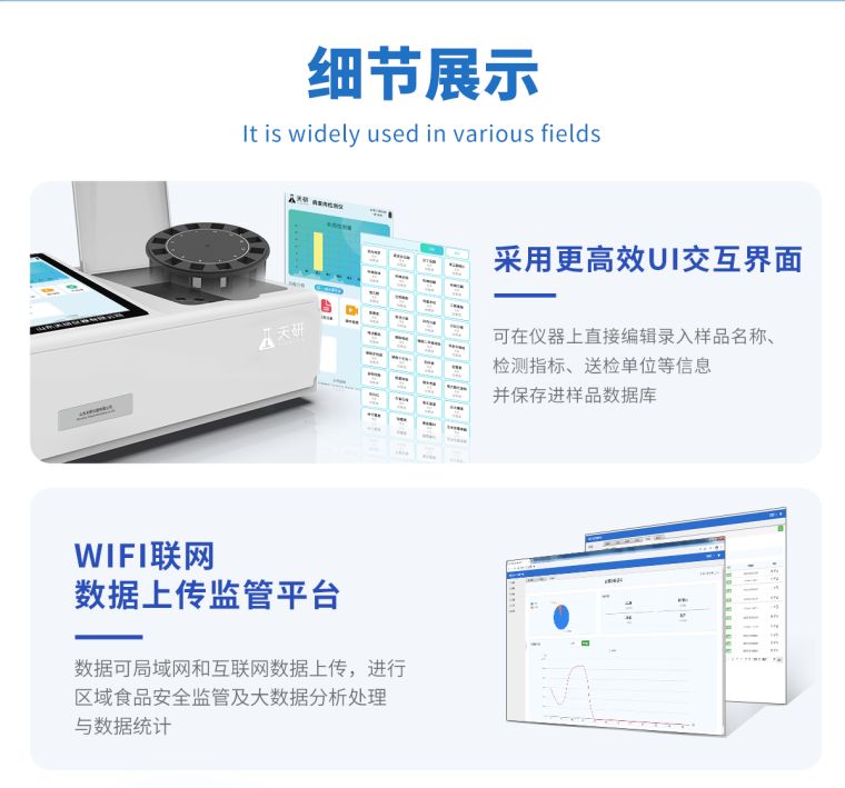 仪器采用台式一体化系统检测技术,将分光光度模块、新型农残检测模块、数字化管理模块、无线通讯模块高度集成于一体,支持检测200种食品安全检测项目,同时预留升级检测方法。