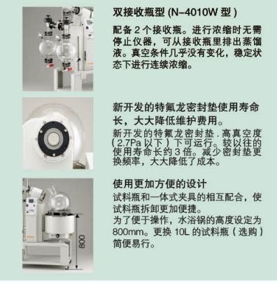 2、 加热用恒温水浴槽为水油两用型,对于高沸点的溶剂也可以进行浓缩。