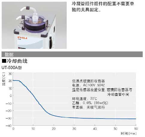 产品名称:小型冷阱装置型号:UT-500A产品代码:257440捕集方式:低沸点溶媒用玻璃回收容器、直接冷凝除湿量:Max.150mL(回收液)最低到达温度:-30℃安全功能:漏电过流保护器、压缩机过热保护、压缩机高压保护开关附属功能:待机指示灯压缩机•冷媒:空冷式 输出100W·R134a带盖接口及排液装置材质:SUS304槽内尺寸(mm)•容量:内径90×145H·0.85L玻璃槽盖连接口径:外径10mm使用环境温度范围:5~35℃外形尺寸(mm)•重量:183W×282D×376(490)H·约15kg电源:5.4A、540VA·AC100V 50Hz产品特点