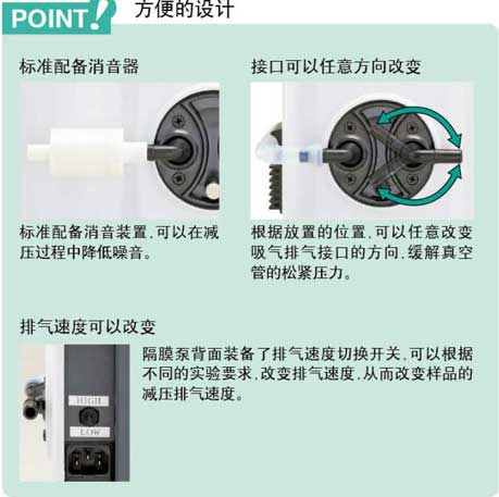 2、 1000型可达30L/mi1000Pa的标准型,2000型可以达到44L/min,1000Pa的大排量型,适合大型装置的减压,2100型可以达到30L/min 200Pa的高真空度型,适用于高沸点试料的浓缩。