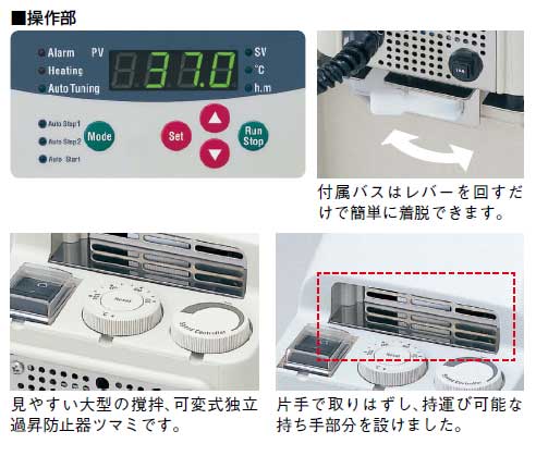 产品名称:投入式恒温水槽型号:NTT-2400产品代码:195436温度调节范围:室温+5~180℃(水时:80℃)温度调节精度:±0.07℃温度控制:微电脑P.I.D控制·SSR输出温度设定•表示:薄膜按键输入、最小设定值0.1℃(2400型为1℃)、数字显示安全功能:自我诊断功能(上下限温度异常检出、加热器断线检知、传感器异常)浮动开关,空烧防止器,独立过升防止器(可变式),电路保护器附属功能:定时功能、报警蜂鸣器、自动调谐加热器:1KW(SUS316L水·油专用)槽内搅拌:外部循环能力:最大流量Max.5L/min传感器:铂电阻pt100W保护盖:NSSC180外尺寸(mm):138(220)W×150(424)D×312(335)H重量:约3.5kg 电源:6A、0.6kVA·AC100V 50Hz产品特点