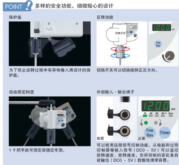 3、 配备了防止马达烧损的保护器、电流限制回路、独立电源开关等安全功能。