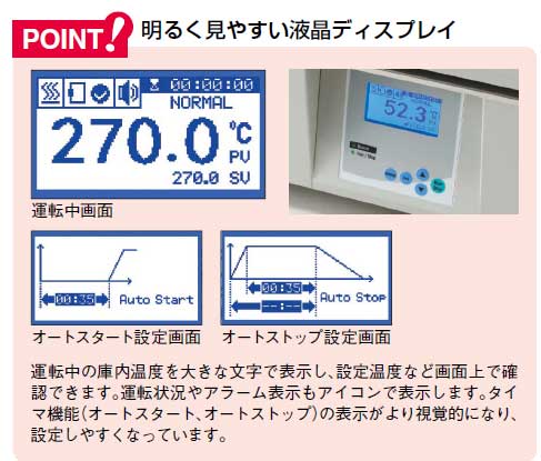 产品代码No.:252260对流方式:自然对流方式温度调节范围·精度:室温~300℃·±1℃以下温度分布(at270℃):空间温度偏差 12℃;温度梯度 18℃温度控制·设定·显示:微型P.I.D控制 SSR输出·薄膜按键输入·数字显示计时功能:自动开机、自动关机、自动开关机、1步骤·2步骤模式安全功能:箱门开放、上下限警报、传感器异常、加热丝断线、SSR异常、漏电·过电流保护器、可变式独立过升防止器加热器:不锈钢加热器1.2kW温度传感器:Pt100Ω工作室尺寸·容量:600Wx544Dx500H·163L隔板耐重·材质:等分布承重Max.15kg/个·SUS304隔板数量:3个(1个是在最下段固定)隔板间隔·段数:30mm·13段箱体内部材质:不锈钢钢板排气口:箱顶2处 φ28mm箱门密封圈材质:硅胶棉使用温度范围:5~35℃外尺寸(mm):700(715)Wx643(675)Dx875(886)H重量:约65kg电源电压:13A、1.3kVA·AC230V 50Hz产品特点