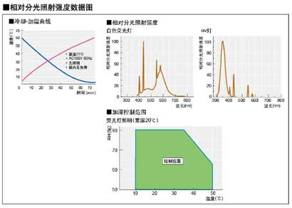 产品代码No.:261570对流方式:下降气流方式温度调节范围·精度:5~60℃(10~60℃ 3000Lx以上)(模式1)、5~50℃(10~50℃ 3000Lx以上)(模式2)·关灯时±0.5℃(模式1)、±1.7℃(模式2)温度分布精度:±3.0℃湿度调节范围·精度:50~80%RH·±5.0%RH(模式1)、±10%RH(模式2)湿度分布精度:±9%RH以内照度调节范围·精度:500~17000Lxx无段调光(10Lx单位)·±100Lx照度分布精度:±6%近紫外线强度测定范围:0~1.20mW/cm2(照度和近紫外线强度值可同时设定)温度·湿度控制:模式1:加热P.I.D控制,SSR输出 模式2:冷冻机ON-OFF控制·P.I.D控制除霜功能:1、自动控制(运行时)2、强制手动式(手动开始、自动停止)安全机能:报警功能(传感器、加热器、电流超荷、停电、SSR、过升·过冷防止、温度梯度、冷却不良)、独立过冷防止功能(独立回路、设置可以5℃为单位更改)、漏电·电流过高保护器、冷冻机电流超荷保护、压力过高保护附属功能:温度校正、RS-232C连接端子、记录仪输出端、报警输出端加热器:900W冷冻机·冷媒:空冷式 输出功率400W·R404A照明:白色荧光灯40Wx12个+近紫外线照灯40Wx3个箱内尺寸·容量:520Wx520Dx1085H·约290L隔板:耐载荷25kg/块 标配3块旋转试料台:可选配LST-7型电源服务插座:2个电线孔:左右各一个、内径40mm外部尺寸(mm)·质量:720Wx888(928)Dx1810H·约243kg产品特点