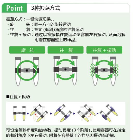震荡方式:旋回、往复、往复+振动震荡速度范围:1-100rpm倾斜角度:0-359°(以1°为增量)计时功能:99小时59分59秒震荡架(另售):4种震荡架允许载荷:约750g(含振荡架)使用环境温度范围:4-50℃使用环境湿度范围:30-80%RH外部尺寸(mm):340Wx160Dx157H重量:约3.2kg电源:0.2A、20VA·AC100V 50/60HZ产品特点