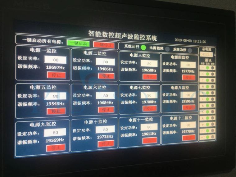 控制系统可以同时与多超声波发生器通讯。在控制系统中还集成了水泵控制调节部分,料筒液位监控,还可以根据系统特殊要求增加水压,水流控制系统。