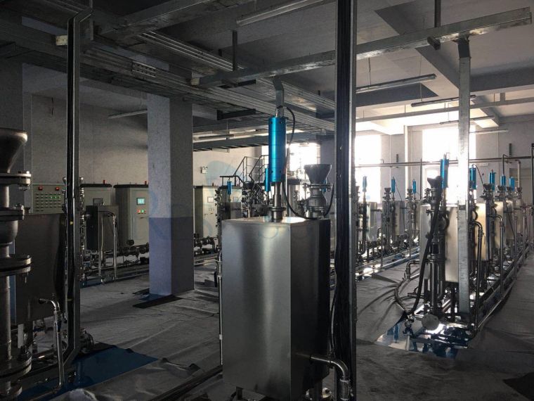 分散式联机成套设备适用于工业化大批量生产,由总控系统、工业型超声波发生器、超声波换能器、连续反应釜、料筒、泵(根据需求选择离心泵或螺杆泵)组成。