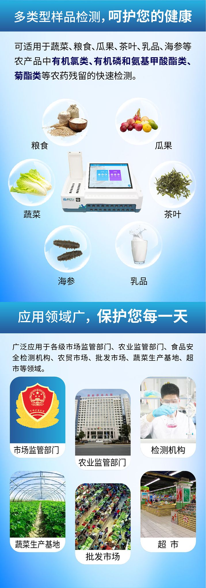 广泛应用于各级市场监管部门、农业监管部门、食品安全检测机构、农贸市场、批发市场、蔬菜生产基地、超市等领域。