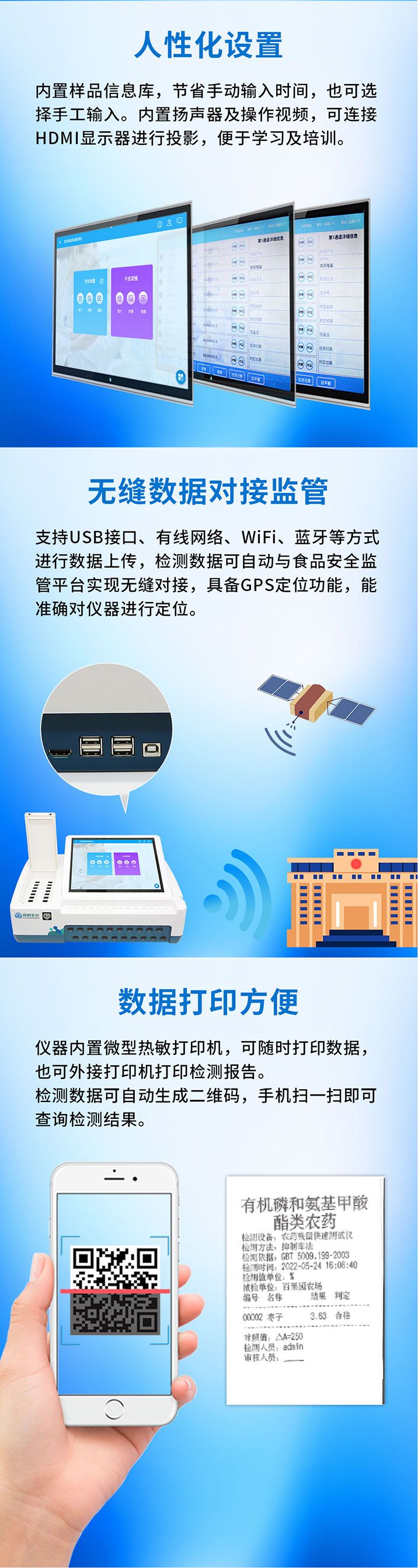 ◇无缝数据对接监管支持USB接口、有线网络、WiFi、蓝牙等方式进行数据上传,检测数据可自动与食品安全监管平台实现无缝对接,具备GPS定位功能,能准确对仪器进行定位。