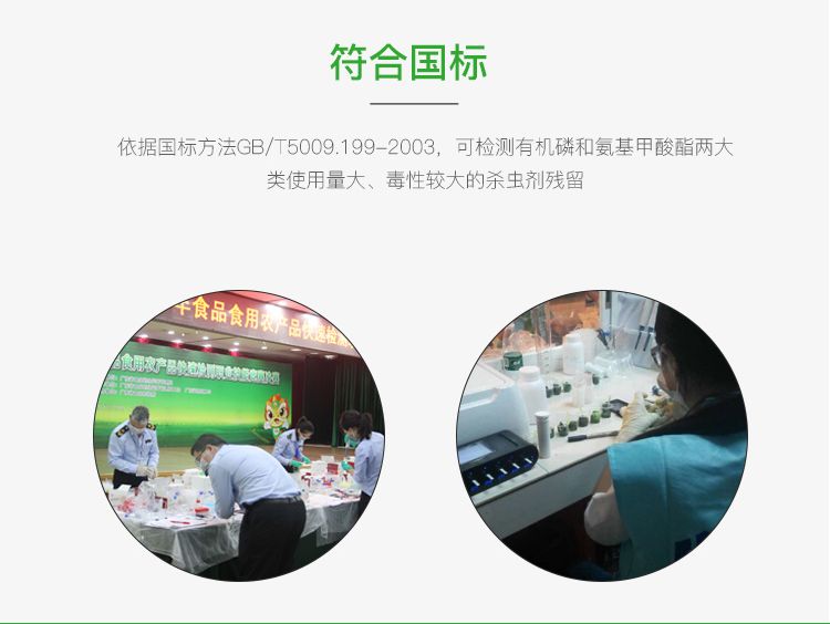 主要用于果、蔬、茶、粮食、水及土壤中有机磷和氨基甲酸酯类农药的快速检测,特别适用于农产品质量检测站的快速检测;果蔬生产基地和专业户采摘前田间地头检测;农贸批发销售市场现场检测;酒楼、食堂、家庭果蔬、茶叶加工前的安全检测。