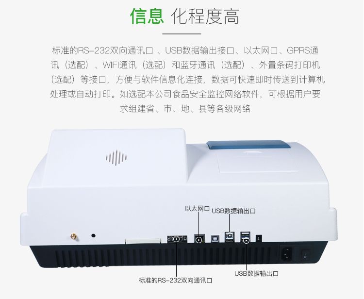 5、信息化程度高:标准的RS-232双向通讯口 、USB数据输出接口、以太网口、可选配多种通讯及打印接口,外置条码打印机(选配)等接口,方便与软件信息化连接,数据可快速即时传送到计算机处理或自动打印。如选配本公司食品安全监控网络软件,可根据用户要求组建省、市、地、县等各级网络。