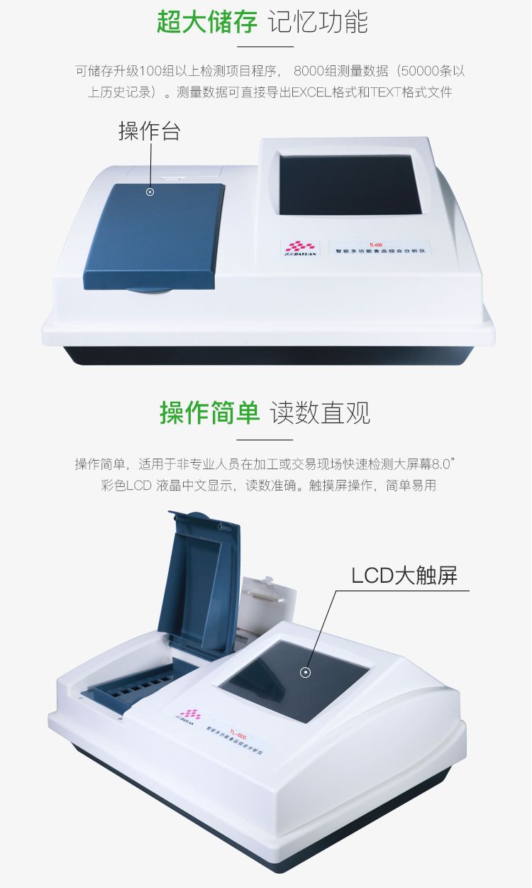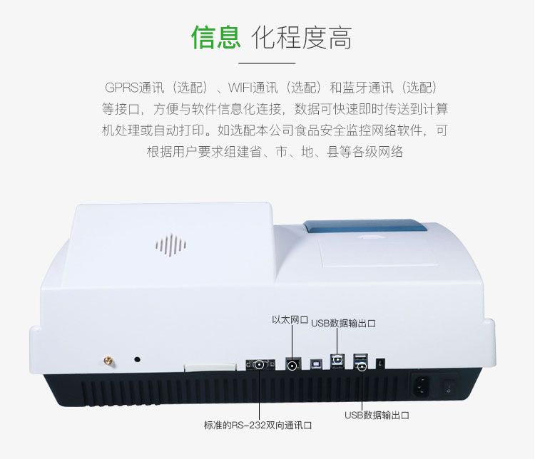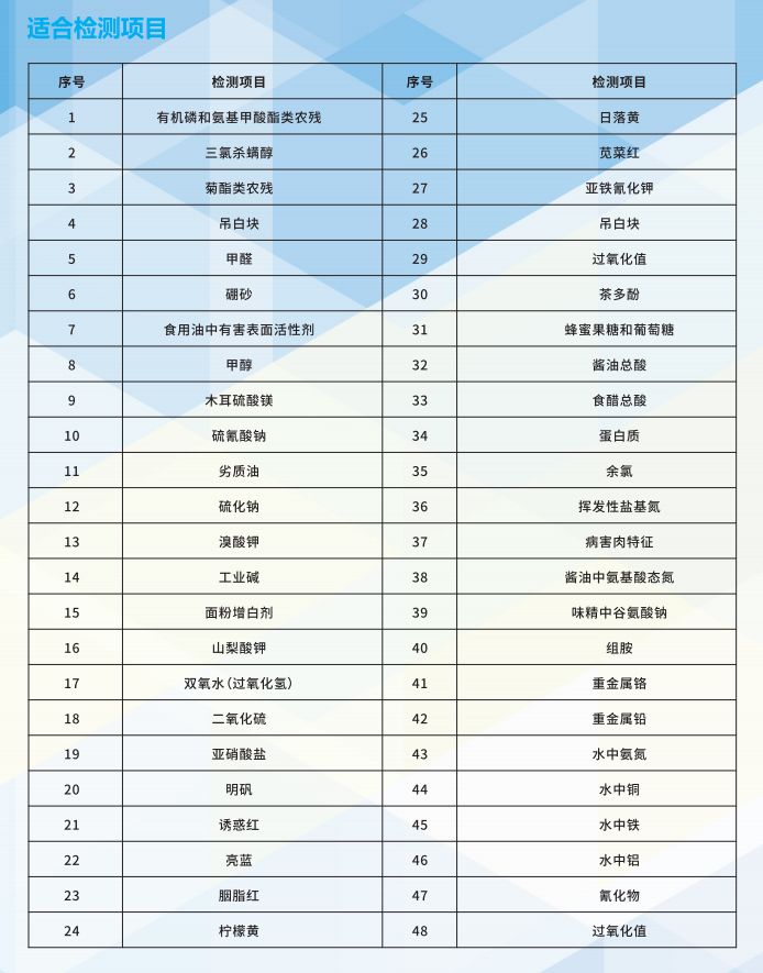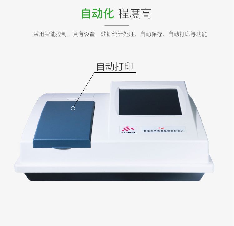 智能多功能食品综合分析仪适用对食品中的不安全指标进行检测,如甲醛、吊白块、双氧水、硼酸、挥发性盐基氮、亚硝酸盐、二氧化硫、蛋白质、余氯、碘盐碘含量、酱油中氨基酸态氮、味精中谷氨酸钠等常见检测项目。