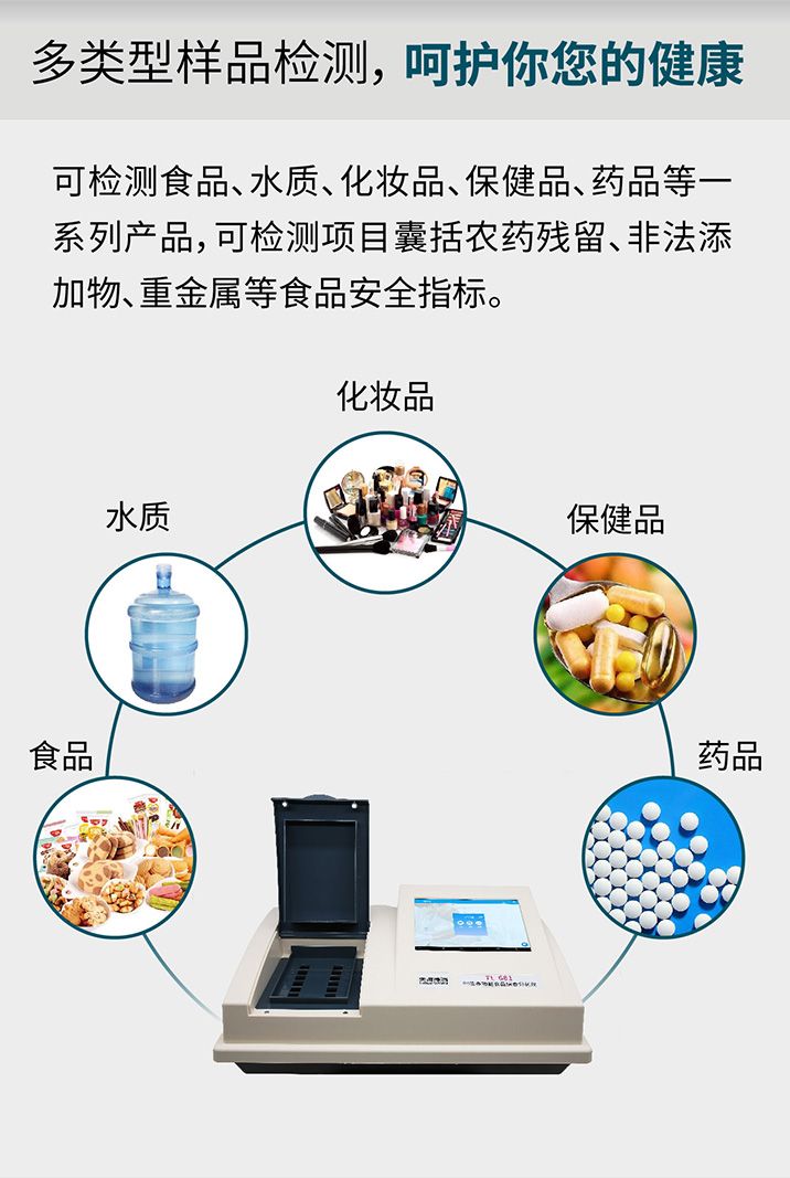 广泛适用于食品生产企业、大中型农副产品批发市场、农业生产基地、农贸市场、 超市、宾馆、餐厅、校园、食堂、科研单位等部门对食品中的不安全指标进行监测。