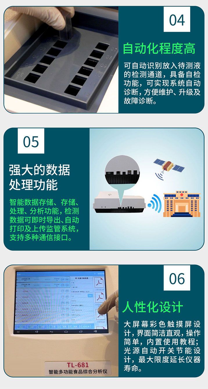 智能数据存储、存储、处理、分析功能,检测数据可即时导出、自动打印及上传监管系统,支持多种通信接口。