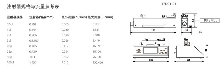 注射器规格:0.5μL~100μL,内置主要厂家,主要型号注射器供选择;可使用自定义注射器,直接输入注射器内径