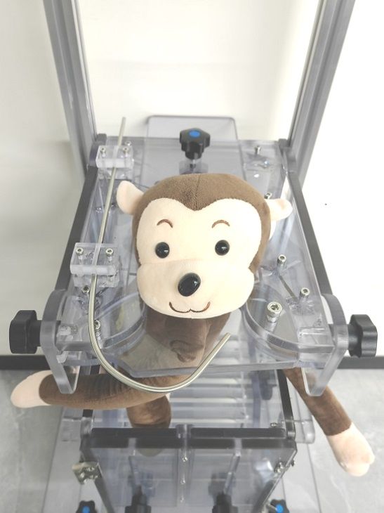 康森特生物科技自主设计生产的猴椅采用不锈钢、铝型材、耐力板等材料制作,能让实验动物的四肢在猴椅封闭区域内自由活动,可以伸手控制操纵杆、触屏等操作,也可以进行给药、微透析探针植入、电极植入、等操作,减少实验动物的肌肉萎缩和不舒适感,可以进行不同品种猴的干细胞治疗、在体电生理、猴子行为学、颅脑给药、神经递质实时检测等实验。