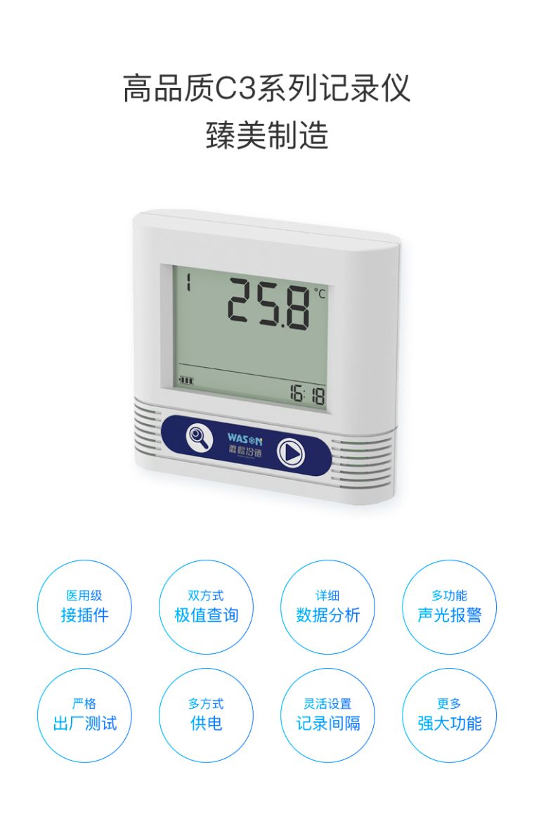 微松C3系列大屏显示温湿度记录仪是一款数据自动存储的单机型精密仪表。该仪表采用低功耗设计,待机时间长;传感器型号多,检测范围广;可外接声光报警器,实现高分贝声光报警。使用C-mi软件可实现参数设置、数据下载、数据分析、数据导出等功能,也可不使用C-mi软件直接从记录仪内拷贝CSV格式数据。广泛应用于食品医药、临床实验、化工电子、档案文博、农业科研等领域。