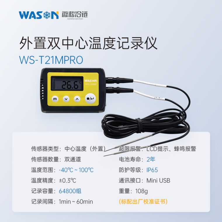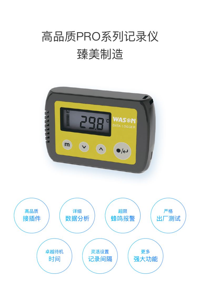 微松微松PRO系列温湿度记录仪是一款数据自动存储的单机型精密仪表。该仪表采用低功耗设计,待机时间长;双腔结构,防水等级高;传感器型号多,检测范围广。使用C-mi软件可实现参数设置、数据下载、数据分析、数据导出等功能,也可不使用C-mi软件直接从记录仪内拷贝CSV格式数据。广泛应用于食品医药、冷链物流、化工电子、档案文博、农业科研等领域。