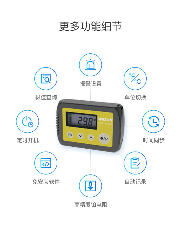 1)无需专用软件下载数据; 2)采用真正USB通讯技术,无需模拟; 3)探头互换性好; 4)一机多过程记录; 5)℃/℉可切换; 6)主机IP65防水等级,适合恶劣环境; 7)低功耗设计,电池寿命:1~2年; 8)ABS工程塑料外壳,双腔壳体设计; 9)LCD显示:温度、时间、电池容量、报警提示等。 |