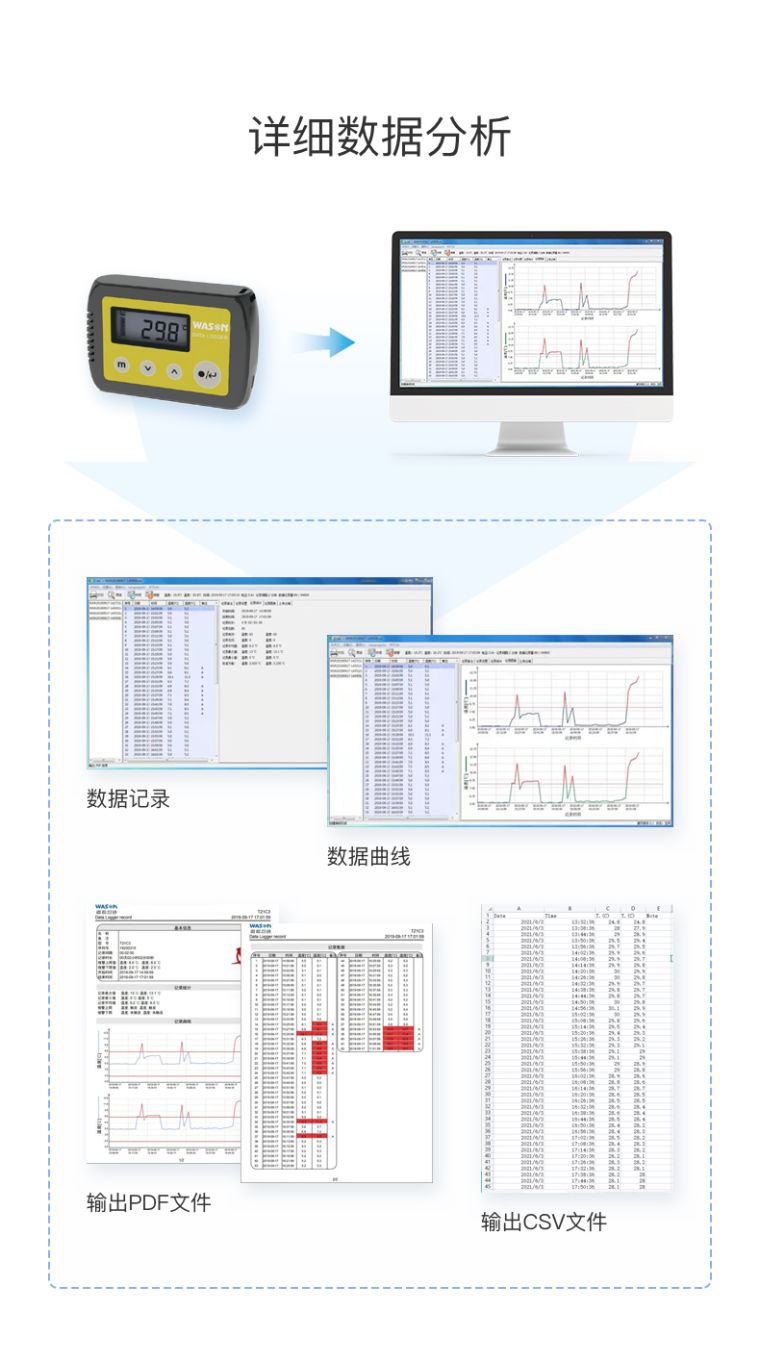 方法二: 当您对数据分析有更多要求时,请使用专用软件下载数据,通过专用软件可以查看数据报表、数据曲线、数据统计、记录备注等信息,还可输出PDF数据文件。 ①拷贝专用软件到您的电脑,绿色软件,无需安装,打开即可使用。 ②停止记录状态下连接记录仪到电脑,进行参数设置。 ③记录仪脱离电脑,放置到需要检测的环境,开启记录。 ④停止记录,连接记录仪到电脑,通过软件查看历史数据、历史曲线、数据统计等,进行数据打印、输出PDF等格式文件操作。 | |