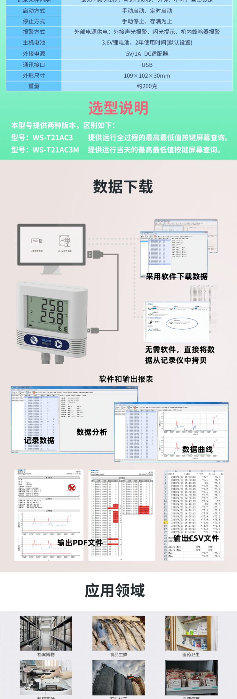 方法二: 当您对数据分析有更多要求时,请选配专用软件下载数据,通过专用软件可以查看数据报表、数据曲线、数据统计、记录备注等信息,还可输出PDF数据文件。 ①拷贝专用软件到您的电脑,绿色软件,无需安装,打开即可使用。 ②连接记录仪到电脑,进行参数设置。 ③记录仪脱离电脑,放置到需要检测的环境进行记录工作。 ④连接记录仪到电脑,通过软件查看历史数据、历史曲线、数据统计等,进行数据打印、输出PDF等格式文件操作。 | |
