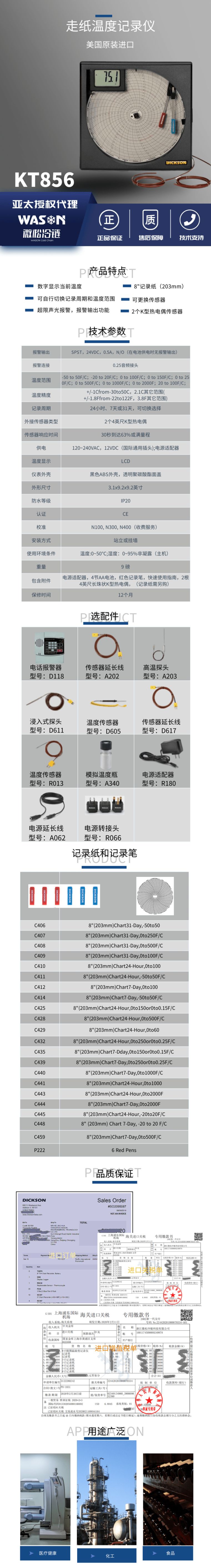 KT856双温度圆盘温度记录仪配备8英寸记录纸和K型热电偶,具有LCD温度显示、报警功能和报警信号输出功能。8英寸记录纸具备的高解析度、LCD当前温度显示报警功能及报警信号输出功能使KT856成为功能最丰富的双温度圆盘温度记录仪。