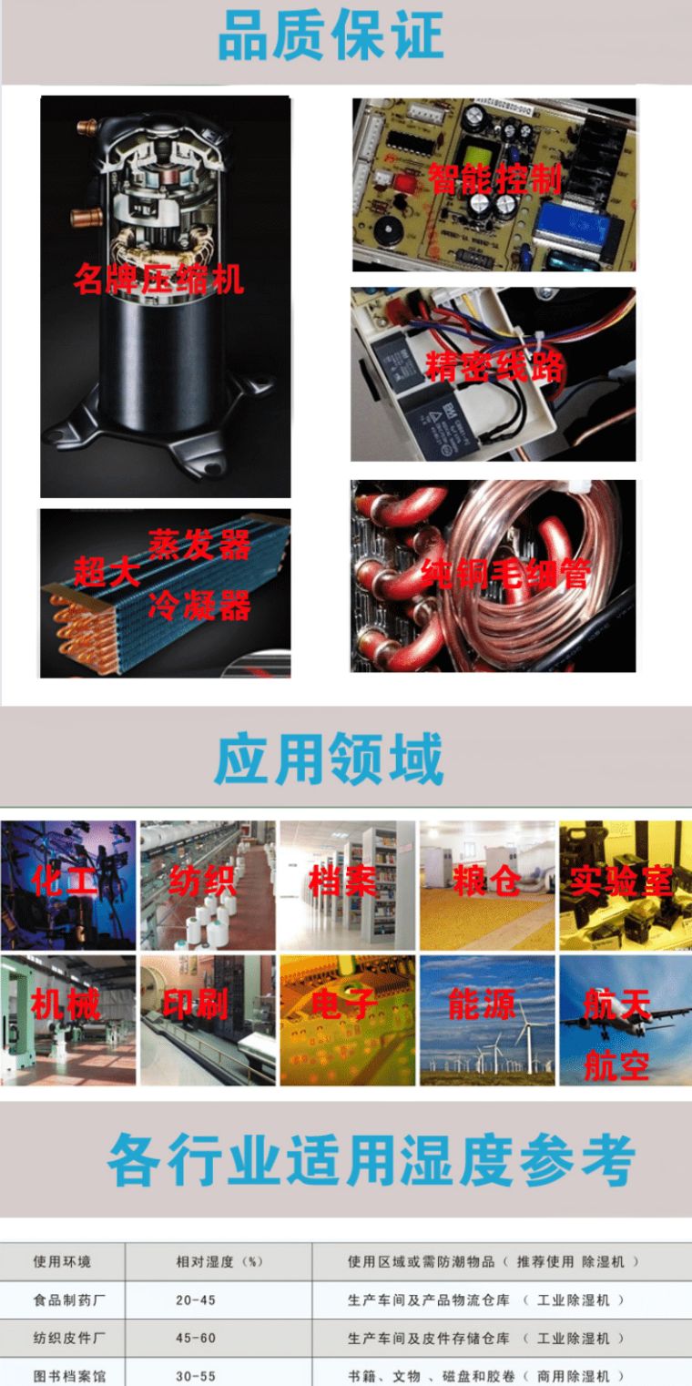 3、存放电子器件、仪表、半导体、光学仪器、精密机械、科学物品、百货、中药材和银行票库或其他需要除湿的空间。