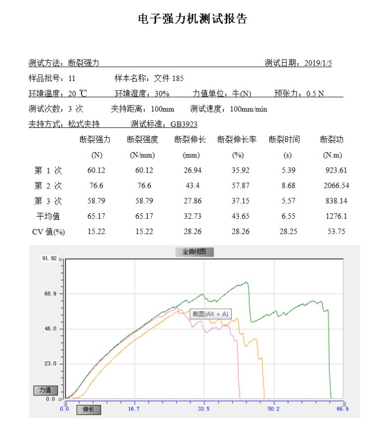 2.测试过程可动态实时显示曲线,可根据用户需要选择强力~伸长、强力~伸长率、强力~时间、伸长~时间等曲线。