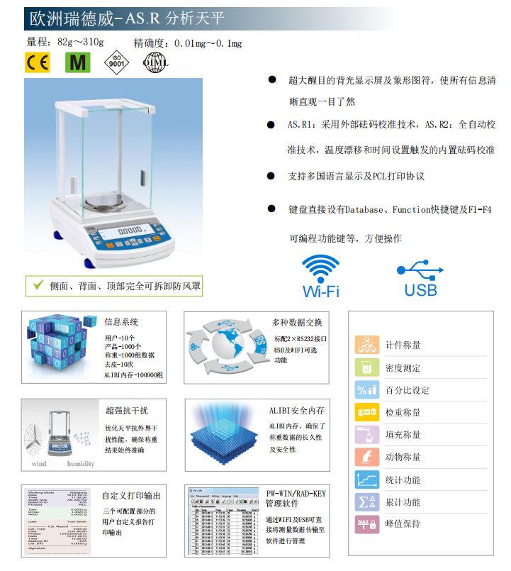 AS.R系列是标准的半微量精度(0.1mg/0.01mg)电子分析天平,普遍的万分和十万分电子天平。采用RADWAG单模块系统传感器和Windows操作系统而开发的称量管理技术,从天平的稳定抗干扰性能,天平的高灵敏度的反应时间,给使用人员带来便捷、简单、安全和准确的称量体验。融合了全自动内校技术,温度和时间的差异,全自动触发天平自校确保称量的可靠和准确。