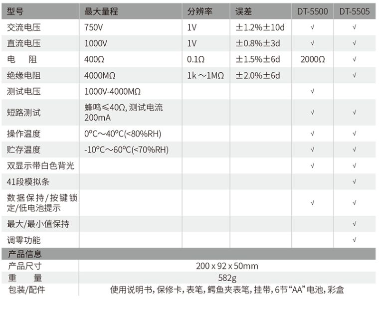 CEM DT-5500/5505数字绝缘电阻测试仪双注塑机壳、高安全性能、高精度测量,使测量更加安全和精准。符合CAT III 1000V,IEC-610-02-031等国际安全标准,同时体积小巧便于携带,可以适用于各种电器设备及绝缘材料的绝缘电阻测量,是对各种电气设备故障检修和设备维护进行保养、试验及检测的工具。