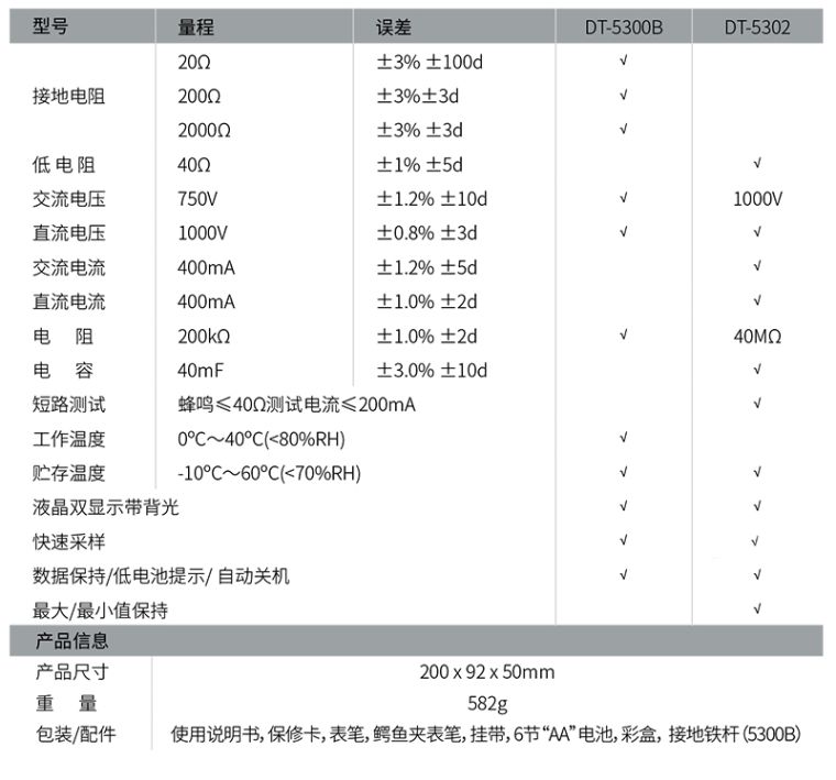 CEM DT-5300B是一款高精度的专业接地电阻测试仪,双注塑机壳、高安全性、测量快速和准确,单手握持测量操作便捷,广泛适用于电气设备测试、工程人员和接地专业人士。