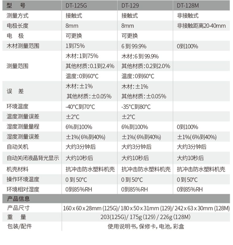 DT-125G应用于测量木材(也包括纸板,纸张)以及坚硬的材质(石膏,混凝土和灰泥)水份温湿度测试产品特性
