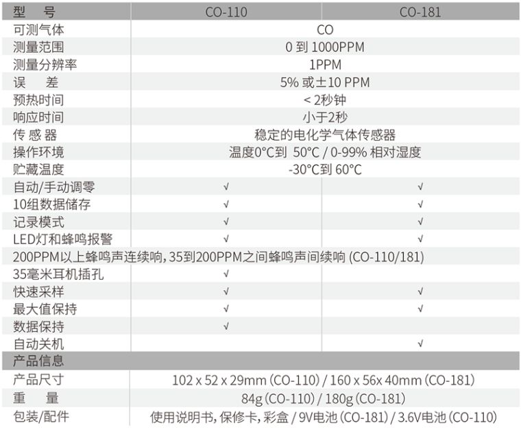 CEM CO-110/181一氧化碳检测仪具有检测0到1000PPM浓度一氧化碳,并设置报警的功能,体积小巧、方便携带,灵敏度高、测量精准,广泛应用于燃气或相关行业的筛选测漏工作。