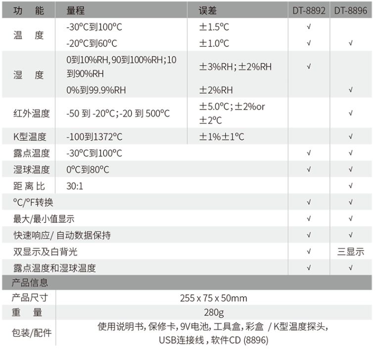 DT-8896 系列专业温湿度测量仪具有空气温度、湿度、露点温度、湿球温度测量等功能,还具有红外温度及K型温度测量功能,内置USB接口可将数据快速,及时的转送到电脑。
