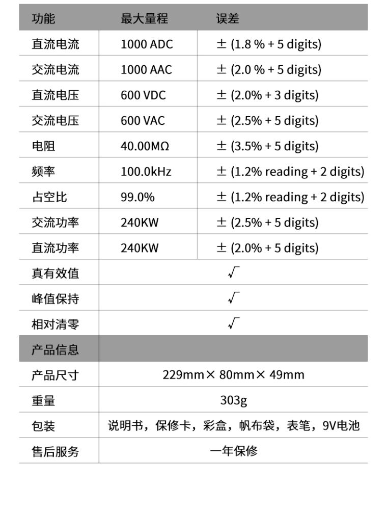 交/直流真有效值功率至240kΩ测量。