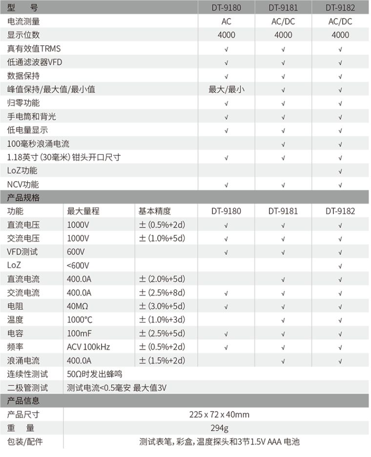 CEM DT-9180/9181/9182系列是CEM华盛昌新设计的400A真有效值工业级交直流数字钳形表,快速采样、真有效值测量、坚实耐用机壳、符合人体工程学设计、4000位计数、VFD、LoZ、浪涌电流等多功能的设计,广泛满足于工业建设、生产和维护的电力、电气和保养的需求。