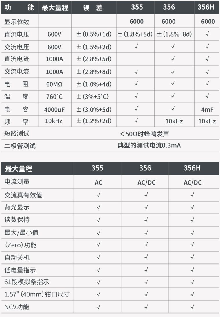 CEM 华盛昌 DT-356H自动量程真有效值数字钳形表,6000位计数,可测1000A交直流电流和600V交直流电压,760℃K型热电偶测温,具有读数保持、背光显示、最大值最小值、61段模拟条显示和非接触电压测试NCV功能。