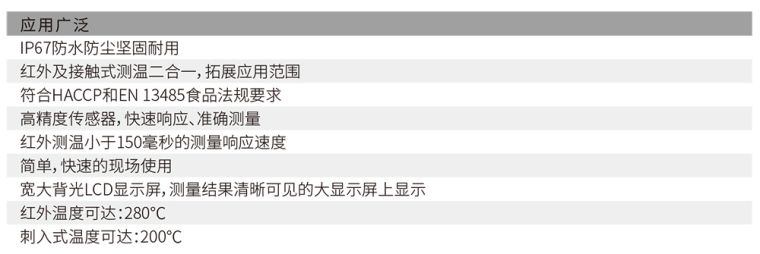 CEM IR-95食品温度计是CEM华盛昌设计、研发和推出的专门针对食品安全温度检验专用的一款测温仪产品,可进行表面及食品中心温度测量;双注塑机壳、IP67防水防尘、坚固耐用、小巧精致、方便携带和测量,明亮大屏LCD显示、方便读数,具有激光瞄准功能和刺入式探头的红外测量仪,适用于食品业,餐馆和商超物流管理以及食品零售业。